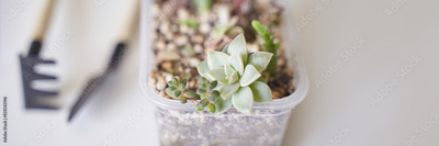A hand tends to a young echeveria in a decorative pot, indoors. Greenery enlivens the room, a blend of nature and modern decor
