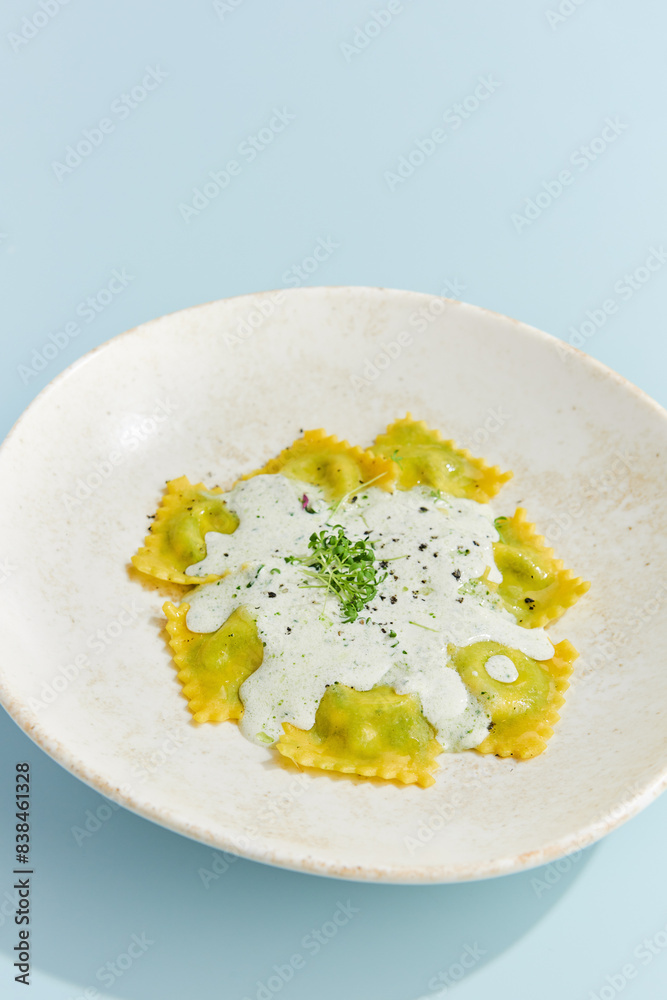 Fresh Spinach and Cheese Ravioli with Creamy Sauce on White Plate against Light Blue Background