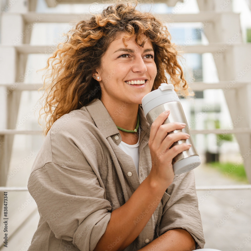 Portrait of woman sit at the stairs and hold thermos cup with coffee