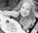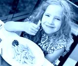 Сhild eating potato chips in the cafe