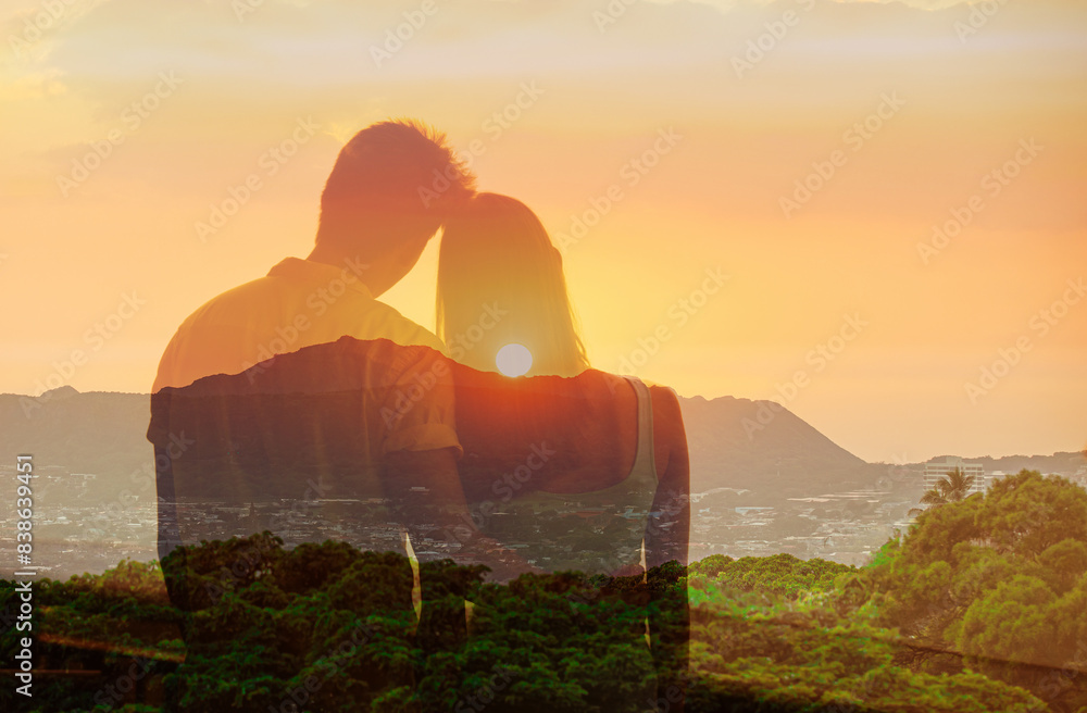 Couple in love embracing bonding watching the Hawaii sunset together, People travel