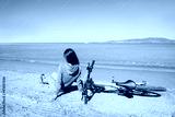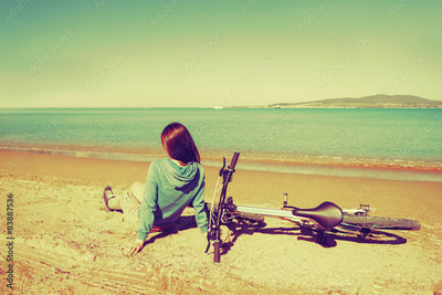 Girl sitting near a bicycle on beach