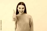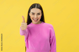 Happy joyful woman with positive smile showing thumb up gesture giving sincere recommendation, approval and advice over yellow studio background.