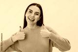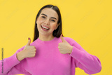 attractive lady with dark hair pointing thumbs up giving recommendation over yellow background.
