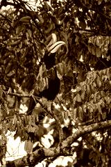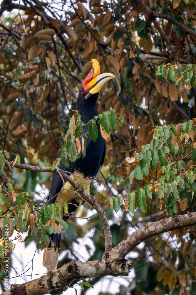 Rhinoceros Hornbill - Buceros rhinoceros, large beautiful iconic bird with colored beak from Southeast Asian tropical forests, Kinabatangan river, Borneo, Malaysia.
