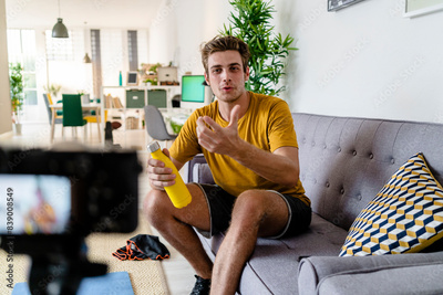 Fitness trainer live streaming fitness session while sitting on sofa at home