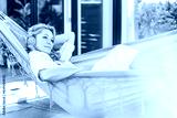 Portrait of pensive mature woman lying in hammock on terrace listening music with headphones