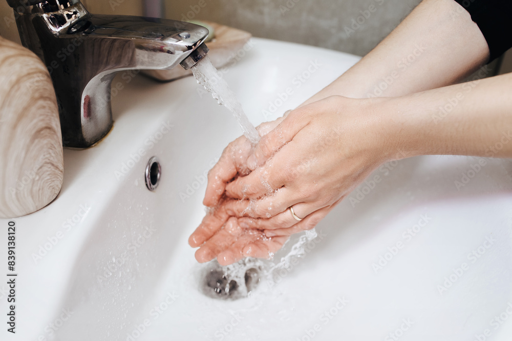 Two female hands with soapy foam in a stream of tap water in the bathroom top view. The concept of hygiene, cleanliness and protection against coronavirus COVID-19.