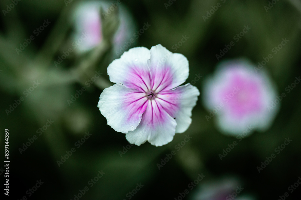 Caryophyllaceae white and pink macro flower with five petals on dark green background. Flowering plant with gently petals close up. Springtime nature.