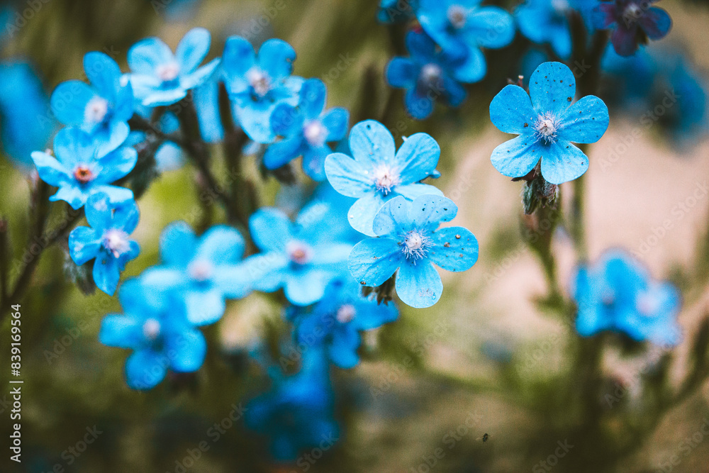 Ancusa Anchusa azurea blooming buds of blue violet flowers in spring garden. Floral postcard, banner with space for text. Flowering plants in sunlight