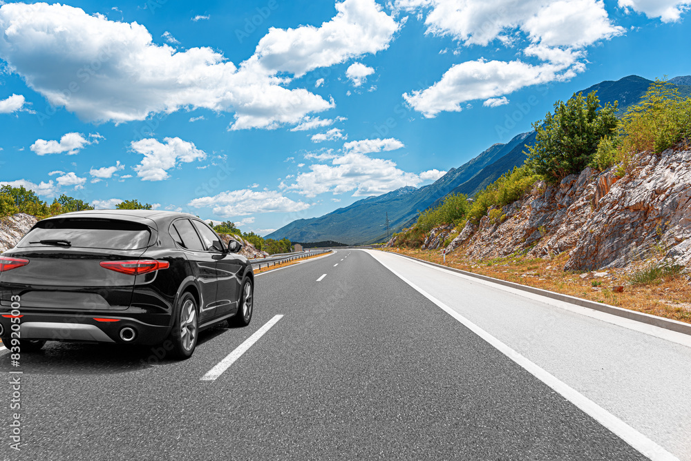 A black car drives along the highway against the backdrop of rocky mountains on a sunny day.