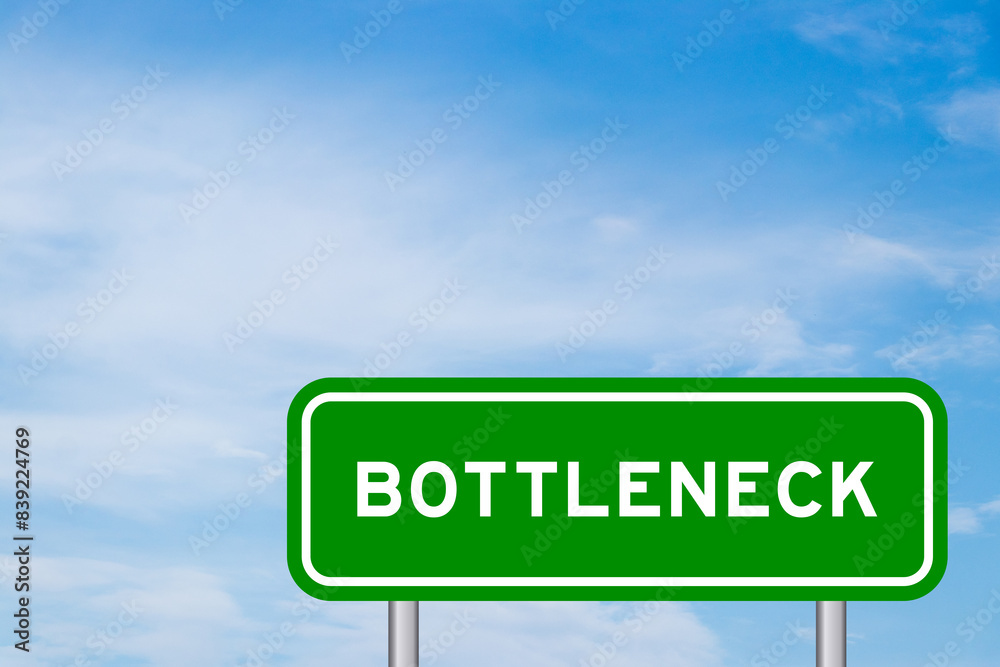 Green color transportation sign with word bottleneck on blue sky with white cloud background