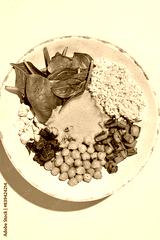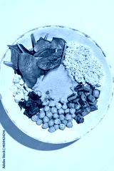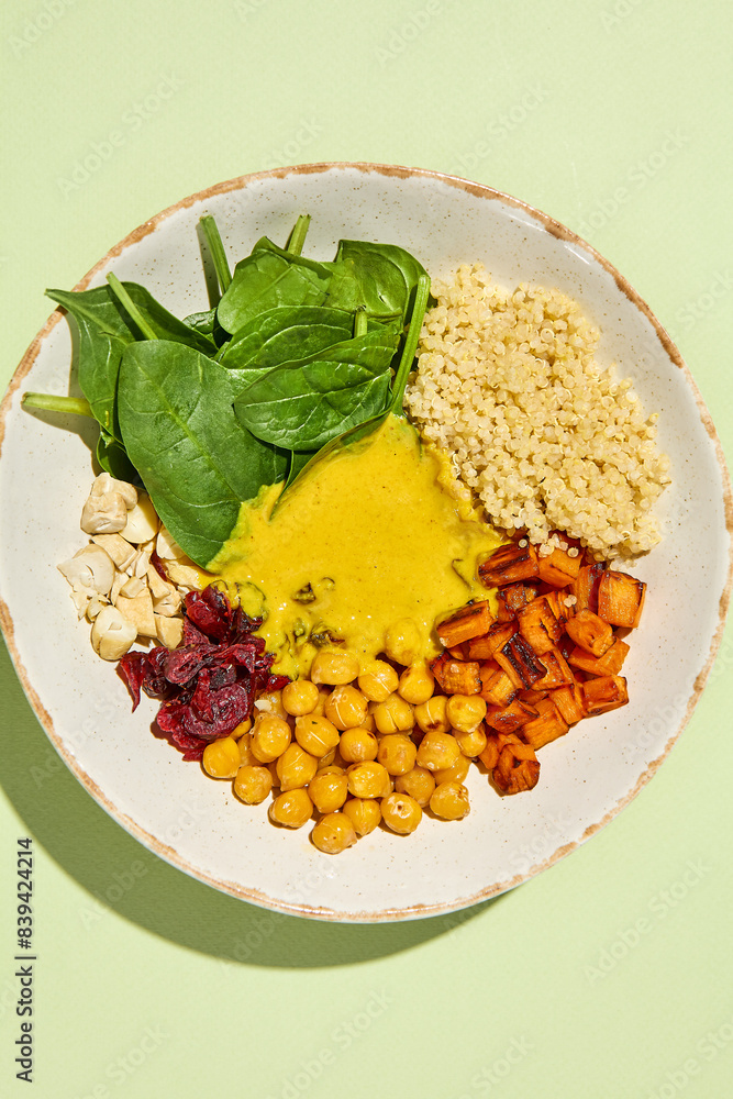 Healthy Buddha Bowl with Sweet Potato, Chickpeas, Quinoa, Spinach, and Mango Sauce
