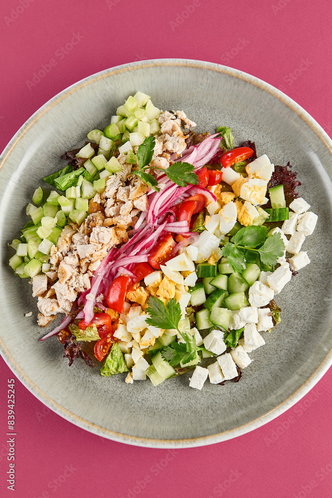 Fresh Cobb Salad with Chicken, Egg, and Vegetables on Pink Background
