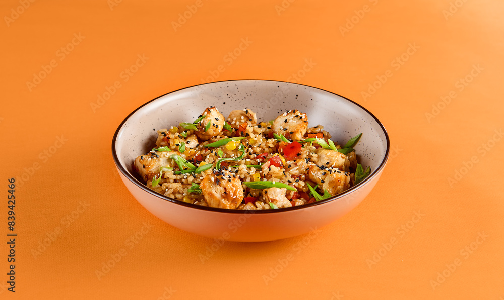 Delicious Wok-Fried Chicken Rice in Bowl - Authentic Tiahan Recipe on Trendy Orange Background