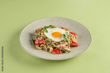 Title Beef Udon Stir-Fry with Vegetables and Sunny Side Up Egg on Top