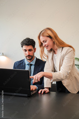 Vertical. One business woman and a businessman working together with a laptop on a job project. Two real coworkers planning using a computer. Teamwork of corporate employees on a brainstorming