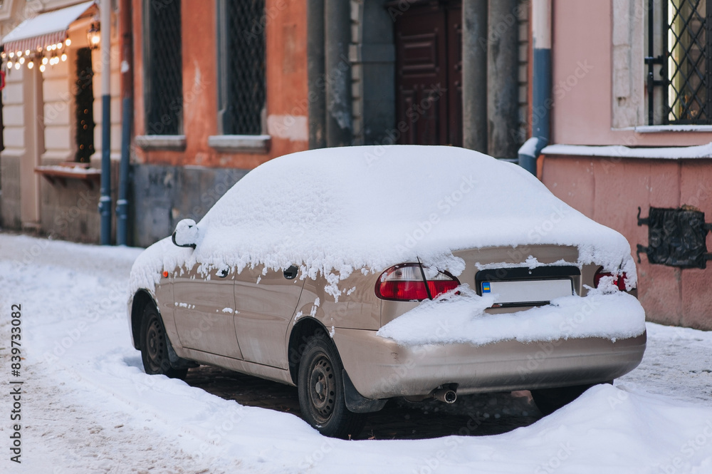 A passenger car is covered with snow and stands on a narrow street in the center of Lviv, Ukraine. Concept of severe winter weather in Europe.