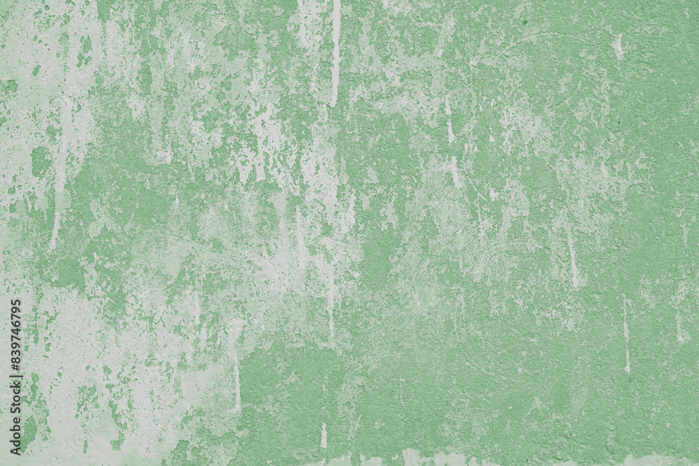 Painted aged green grungy concrete background texture. Abstract wallpaper, shabby distressed stone wall with streaks of paint, vintage stucco surface, backdrop