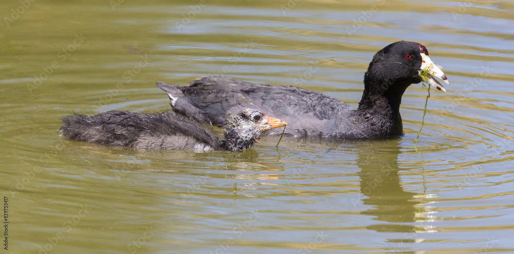 American Coot Adult and Chick Feeding on Aquatic Plants. Grant Lake, Joseph D. Grant County Park, Santa Clara County, California.