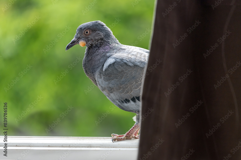 The pigeon walks on the open window and look into the room