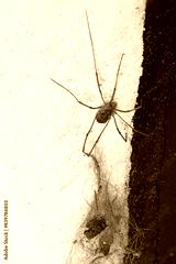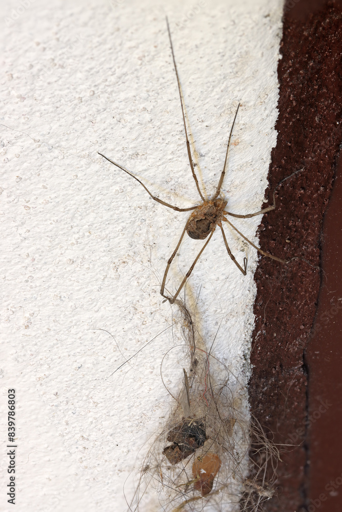 A spider Opilio parietinus crawls up a wall and dragging a clump of dust stuck to his leg