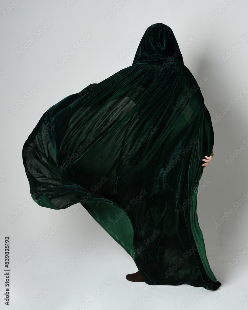 Full length portrait of red haired female model, wearing green medieval fantasy costume, long flowing hooded velvet cape. Standing pose, walking away backwards , isolated white studio background.