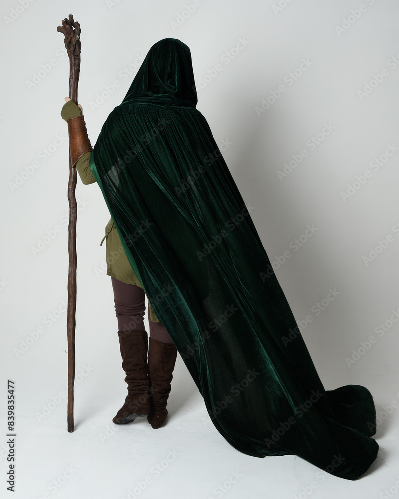 Full length portrait of red haired female model wearing green medieval fantasy costume leather armour, dramatic long flowing hooded velvet cape. Standing walking pose, isolated white studio background