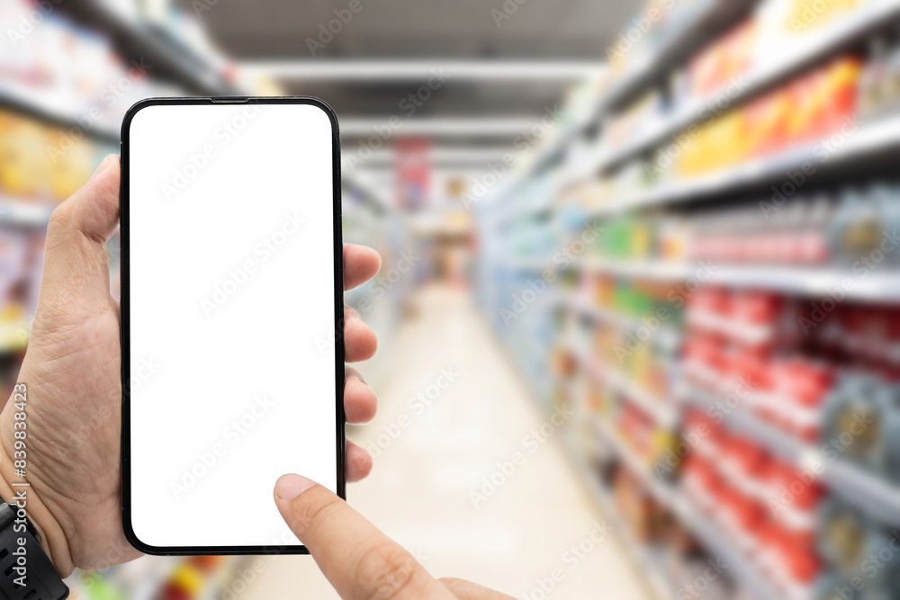 Hand holding blank screen smartphone for copy space on blurred Miscellaneous Product shelf. e-commerce app shopping mockup. social media, payment and shopping online concept.
