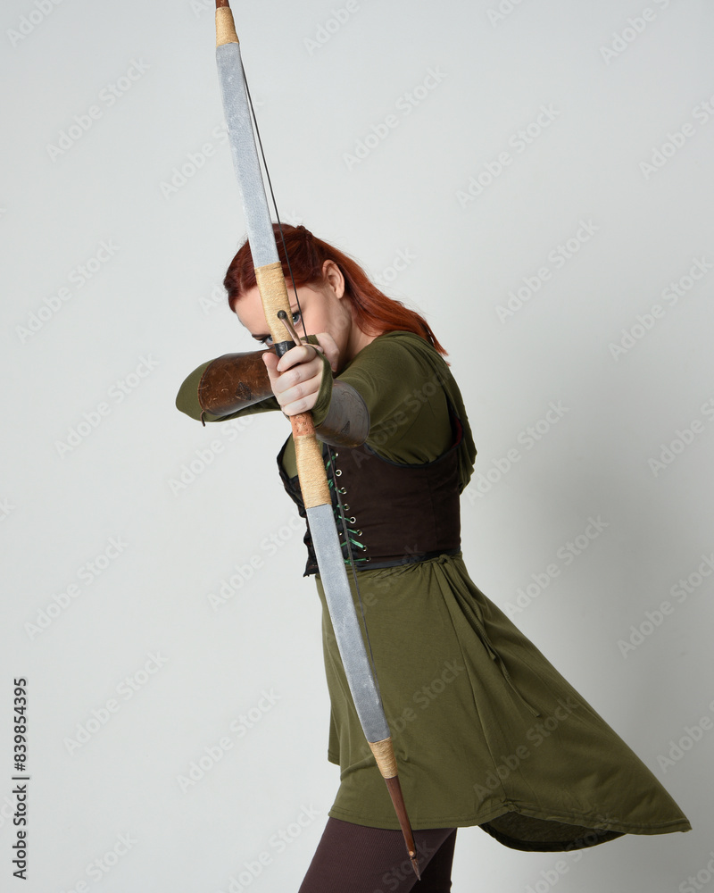 Holding archery bow and arrow weapon, standing action pose isolated on white studio background.