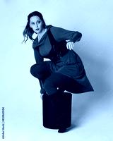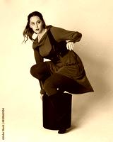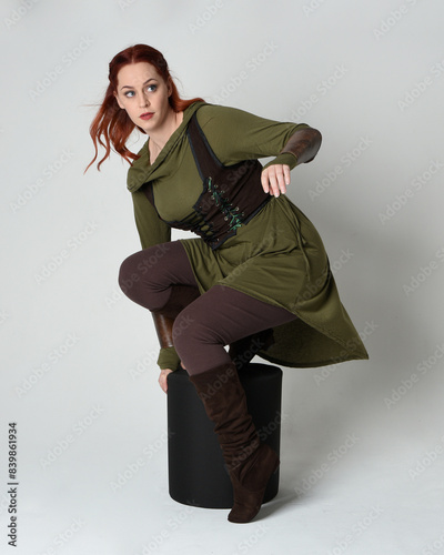 Full length portrait of red haired female model wearing green medieval fantasy costume, leather armour.