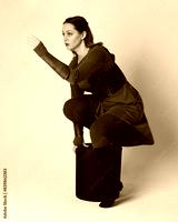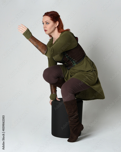 Full length portrait of red haired female model wearing green medieval fantasy costume, leather armour. Sitting crouching pose on plinth, isolated on white studio background.