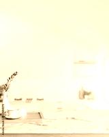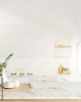A space for displaying products on a white marble kitchen countertop in a minimalist white kitchen.