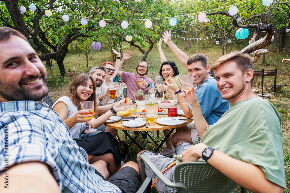 Happy young adult friends having fun enjoying barbecue party in the summer garden