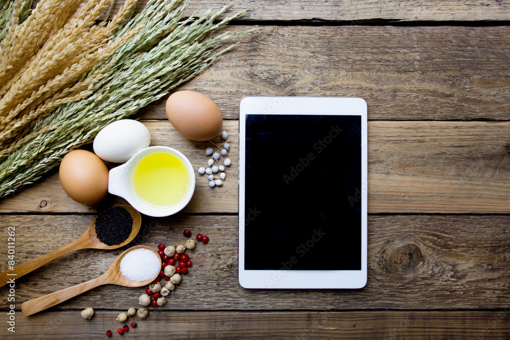Food ingredients , kitchen utensils for cooking on wooden backgr