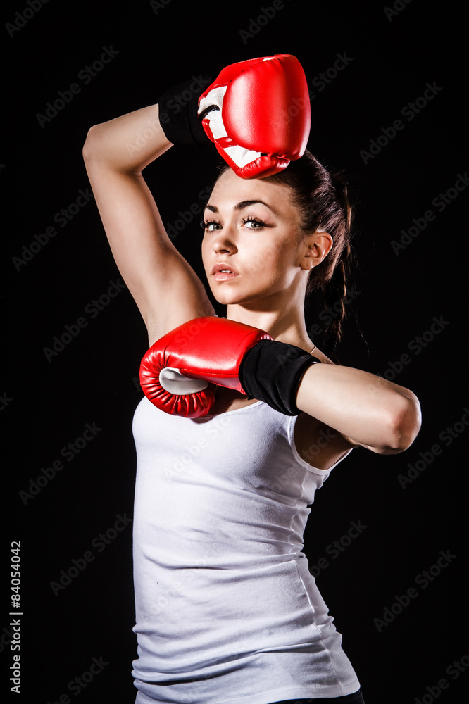 Beautiful young woman in a red boxing gloves