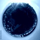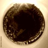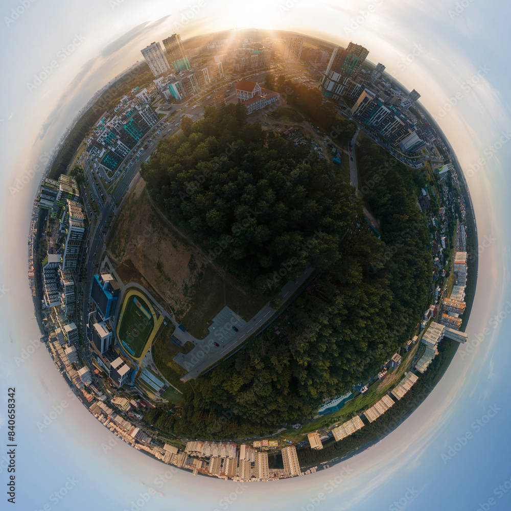 Panoramic view from drone, small planet and blue sky around the globe