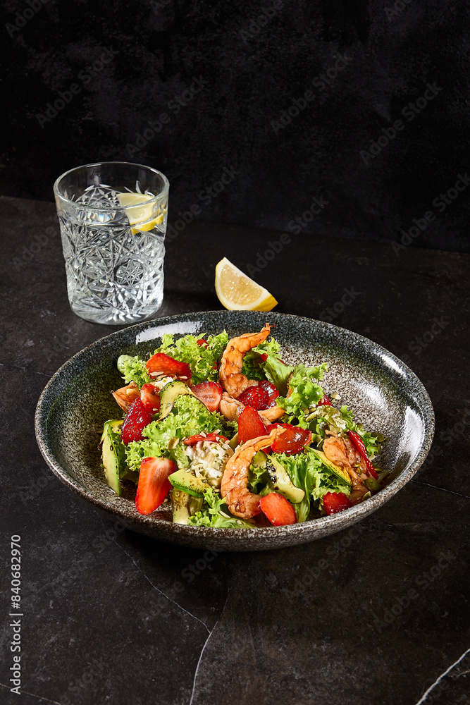 Fresh Shrimp and Strawberry Salad in Bowl with Lemon Drink on Dark Background