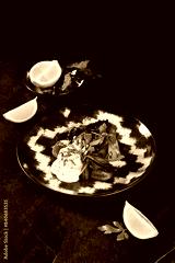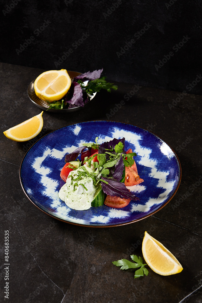Fresh Eastern Vegetable Salad with Basil and Sour Cream on Artistic Plate