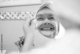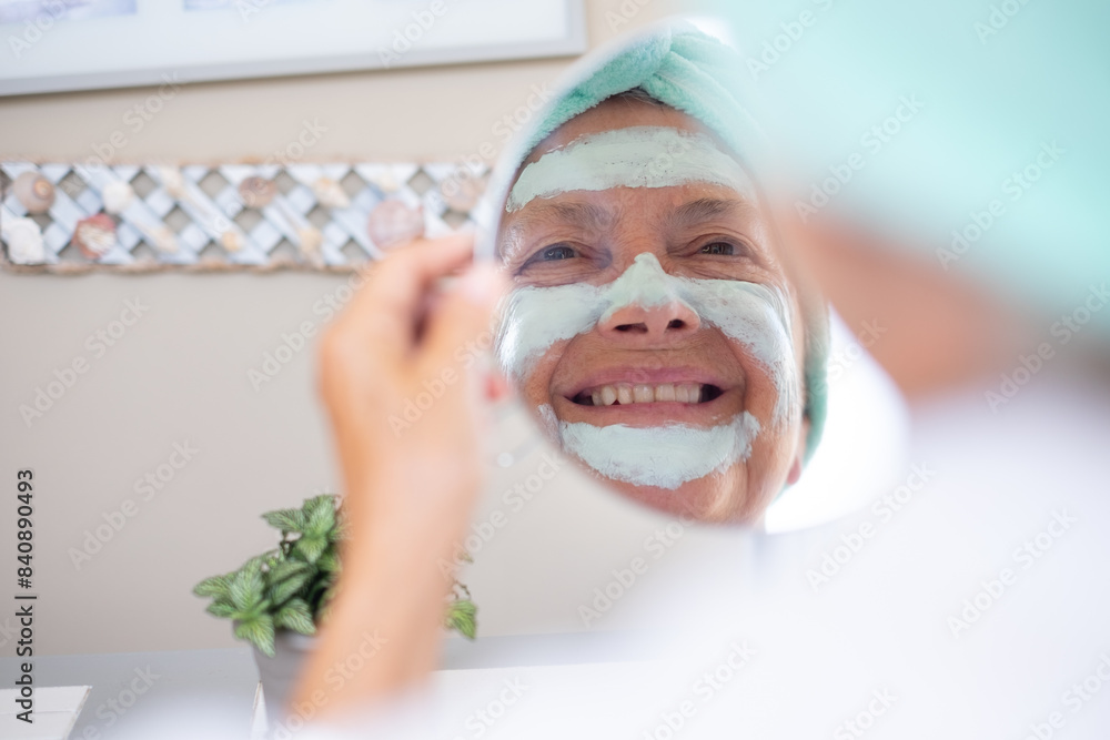 Portrait of a pretty smiling senior woman applying a cleansing mask on her wrinkled face looking in the mirror - take care of your skin concept
