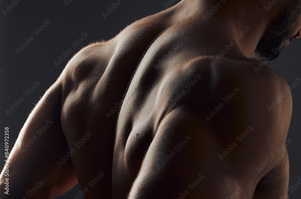 Closeup, muscle and back of man for exercise with workout, gym aesthetic and results for fitness goals in studio. Topless guy, bodybuilder and sexy body with shoulder training by black background
