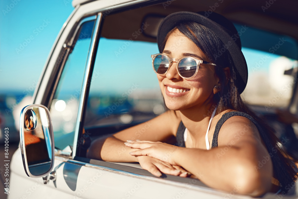 Woman, van and road trip or window resting, friends and fun adventure for summer vacation together in transport. Travel, happy and smile for journey on weekend break, driving and relax in vehicle