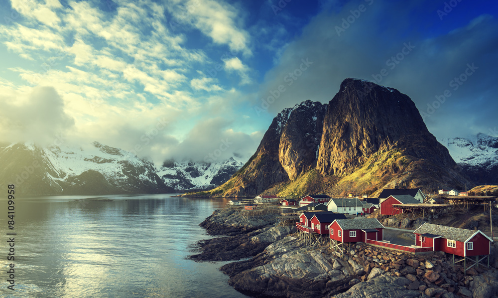 Fishing hut at spring sunset - Reine, Lofoten islands, Norway
