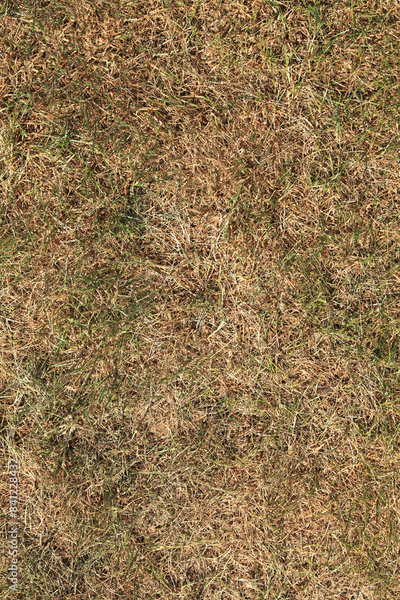 Dry grass. Grass from above, texture, background. Variegated and uneven color of green between faded grass on the lawn. Vegetation cover and natural surface background. Natural grass carpet outdoors