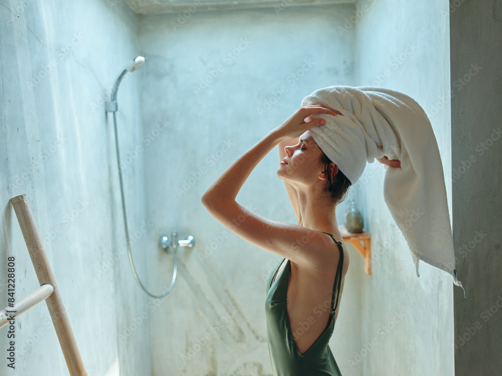 Woman standing in shower with towel on head and around neck after relaxing spa day
