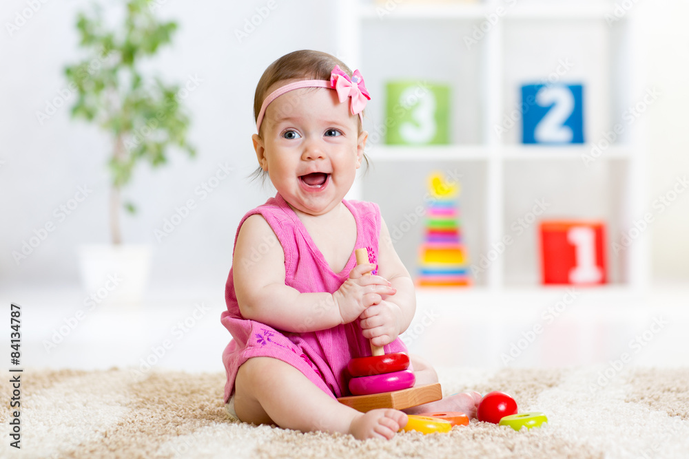 cute baby playing with colorful toy pyramid