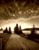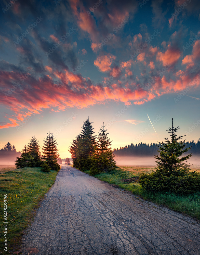 Fantastic summer in Durmitor National Park with old country road, Montenegro. Breathtaking foggy scene of Montenegro countryside, Zabljak resort location. Beauty of nature concept background.