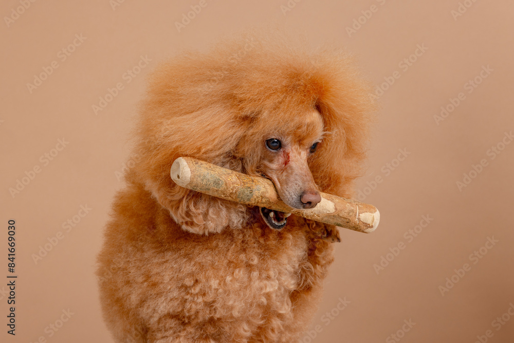 the owner trains a poodle dog, gives a stick to the paws, animal training concept
