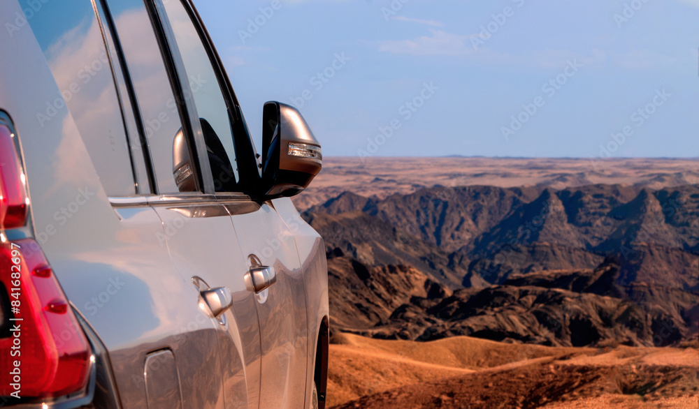 Close-up of a vehicle in the sand before a cliff. Moon valley. Africa.