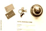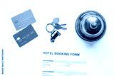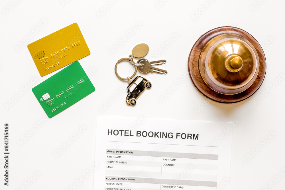 reservation form on hotel reception desk background top view
